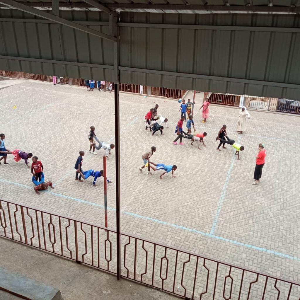 Siguiendo la tónica marcada desde nuestra llegada, el quehacer diario comienza a las 5:30 de la mañana. Desde el alba y hasta el ocaso, comenzando con la oración de las 6:00, es un no parar entre compartir las tareas domésticas de limpieza y cocina, así como preparar y desarrollar las actividades que trabajaremos a lo largo del día tanto con los niños como con las Hermanas. Álex y Cati, durante las mañanas, hemos atendido a una media de 120 niños/as con edades comprendidas desde el año y medio hasta los 15 años. Al mismo tiempo, el Hno. Santi se dedica a instruir a las hermanas en diversos conceptos y ejercicios prácticos que les puedan servir en la tarea docente de los niños de la escuela. Juegos educativos, canciones, colorear, manualidades varias, ejercicios sencillos de inglés, entre otras actividades, ha sido la batería de recursos didácticos que ha configurado la sesión diaria de aprendizaje y entretenimiento con el alumnado del centro. Igualmente, con doble sesión diaria, mañana y tarde, entre los tres voluntarios, ha sido bastante amplia la diversidad de tareas desarrolladas con las religiosas. A destacar, manualidades en papel, en tela, canciones, sopas de letras, adivinanzas, estudio de verbos, curso de primeros auxilios, cultura general tanto africana como española y recetario de cocina, entre otras. En todo momento, con estas últimas, las hermanas, el principal objetivo que ha llevado aparejado cada actividad ha sido el aprendizaje de la lengua española, aunque también se ha procurado que conocieran dinámicas/metodologías nuevas a aplicar en el aula con el alumnado.
