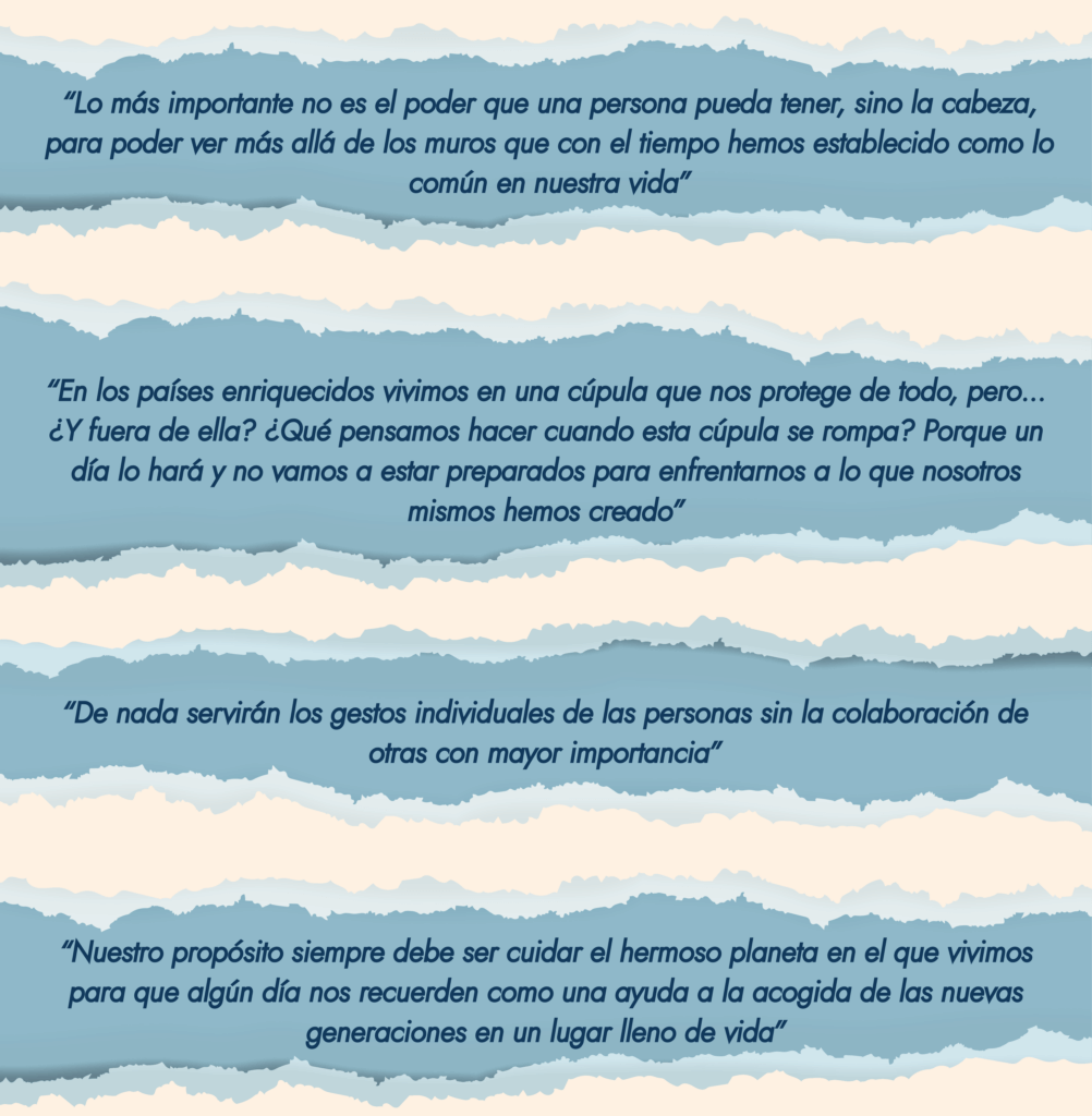 Se evidencia que su generación es capaz de analizar la situación actual de forma crítica, tomando conciencia de la realidad. Necesitamos, de forma colectiva, reestructurar el presente para proyectar un futuro próspero en el que todas las personas podamos vivir de una forma digna siendo respetuosos/as con el planeta. La posibilidad de cambiar el mundo está de nuestra mano.