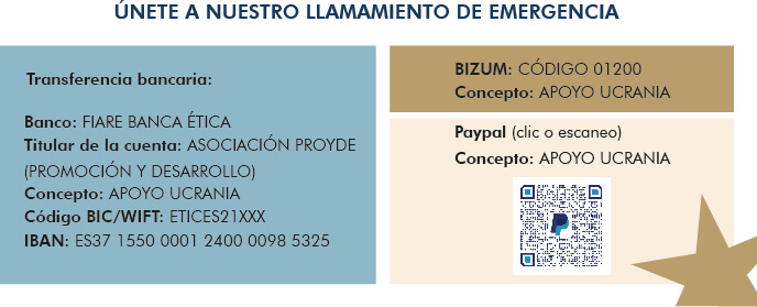 Los refugiados ucranianos ya están llegando a España y a Italia. Por este motivo hemos decidido en PROYDE, tras hablarlo con Solidarietà (Roma), enviar una parte de los fondos que hemos recibido y otra destinarla a las necesidades que encuentran los ucranianos que van llegando a España.