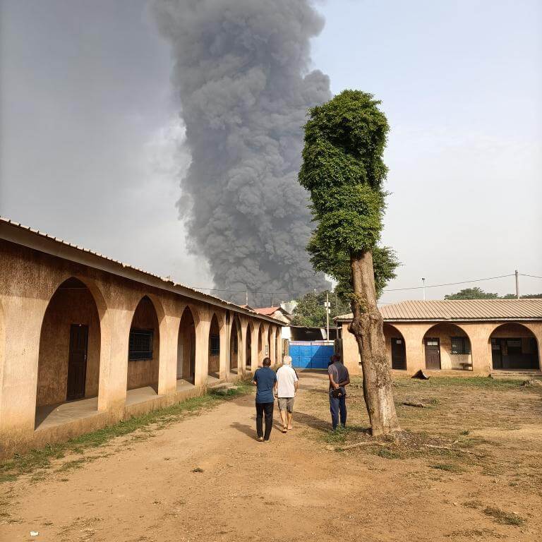 La finalidad de mi visita, por tanto, era conocer de primera mano el funcionamiento del centro y poder encontrarme con responsables locales, profesores, educadores, alumnado y empresas locales. Lamentablemente, no contábamos con un incidente inesperado, que torció los planes por completo. La madrugada del lunes 18 de diciembre, pocas horas después de mi llegada, se produjo una gran explosión en el puerto de Conakry, donde se hallaba el principal depósito de hidrocarburos del país. La deflagración se saldó con numerosas pérdidas humanas y materiales.