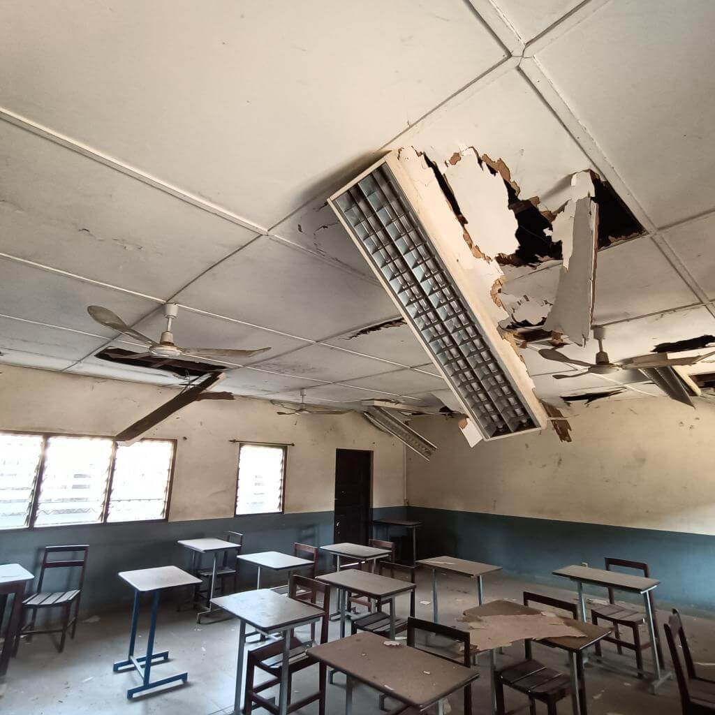 La comunidad de La Salle y el centro de formación se encuentran a menos de 1 km del puerto, en el mismo barrio de Kaloum. Afortunadamente, ni en la comunidad, ni el CFP, hubo que lamentar daños personales, pero sí cuantiosos daños materiales. La propia comunidad quedó muy afectada en estructuras, ventanas, puertas, techos, etc. Por su parte, el centro de formación, ubicado junto a la comunidad, más cercano a la zona del incidente, sufrió numerosos daños en la mayoría de sus aulas y equipos, quedando en un estado muy penoso. Durante los días posteriores a la explosión, estuvimos haciendo balance de daños y pudimos constatar que habrá que hacer un gran esfuerzo para poder rehabilitar las aulas y los equipos electrónicos dañados. Como consecuencia inmediata de la explosión, el barrio de Kaloum quedó cerrado y, obviamente, el suministro de combustible quedó paralizado en todo el país. Lógicamente, las clases también se suspendieron.