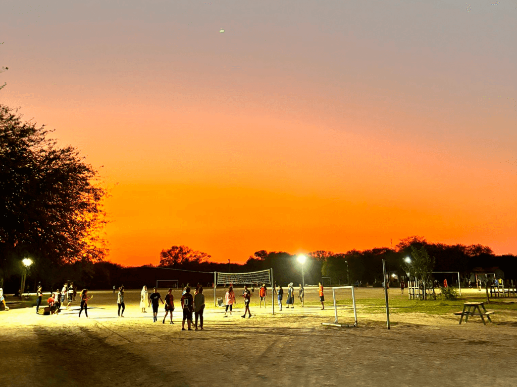 Nunca olvidaremos esta experiencia con la que ya es nuestra familia chaqueña, tampoco nuestros paseos al atardecer por los Tajamares de la zona en busca de Yacarés (cocodrilos) asomando sus cabecitas fuera del agua. Esos atardeceres con un sol rojo fuego que bañaban las canchas de deporte donde los niños reían y jugaban como si el tiempo se parara.